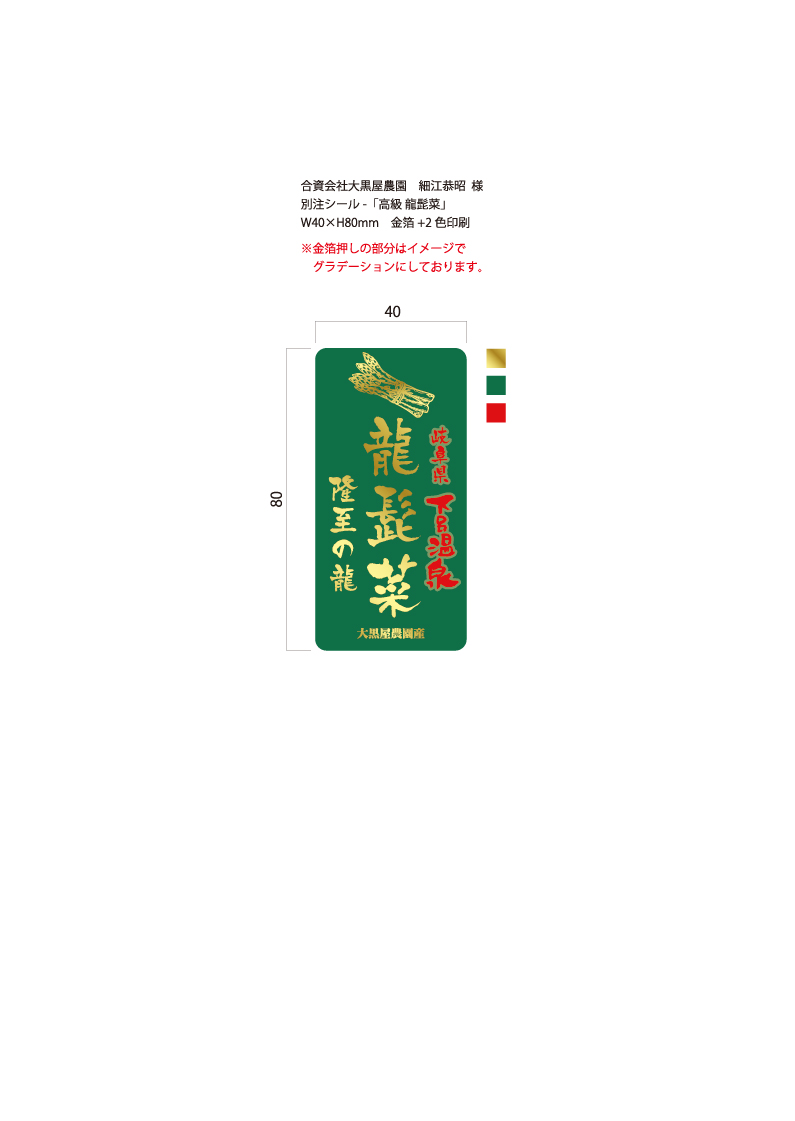 シール 龍髭菜 W40×H80 金箔+2色印刷 5,000枚(大黒屋農園 様)