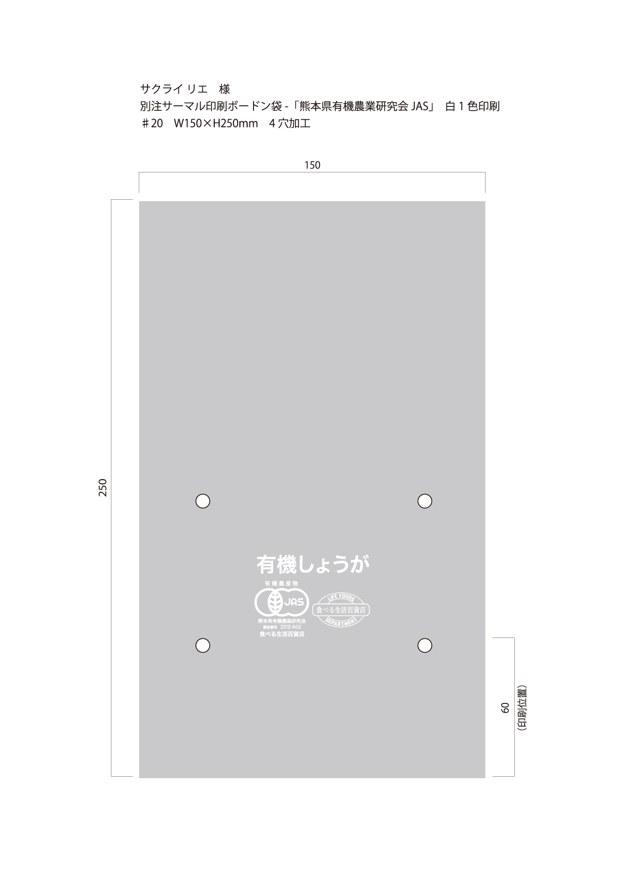 別注サーマルボードン袋 有機しょうが ♯20×150×250 4穴 白1色 2,000枚(櫻井 様)
